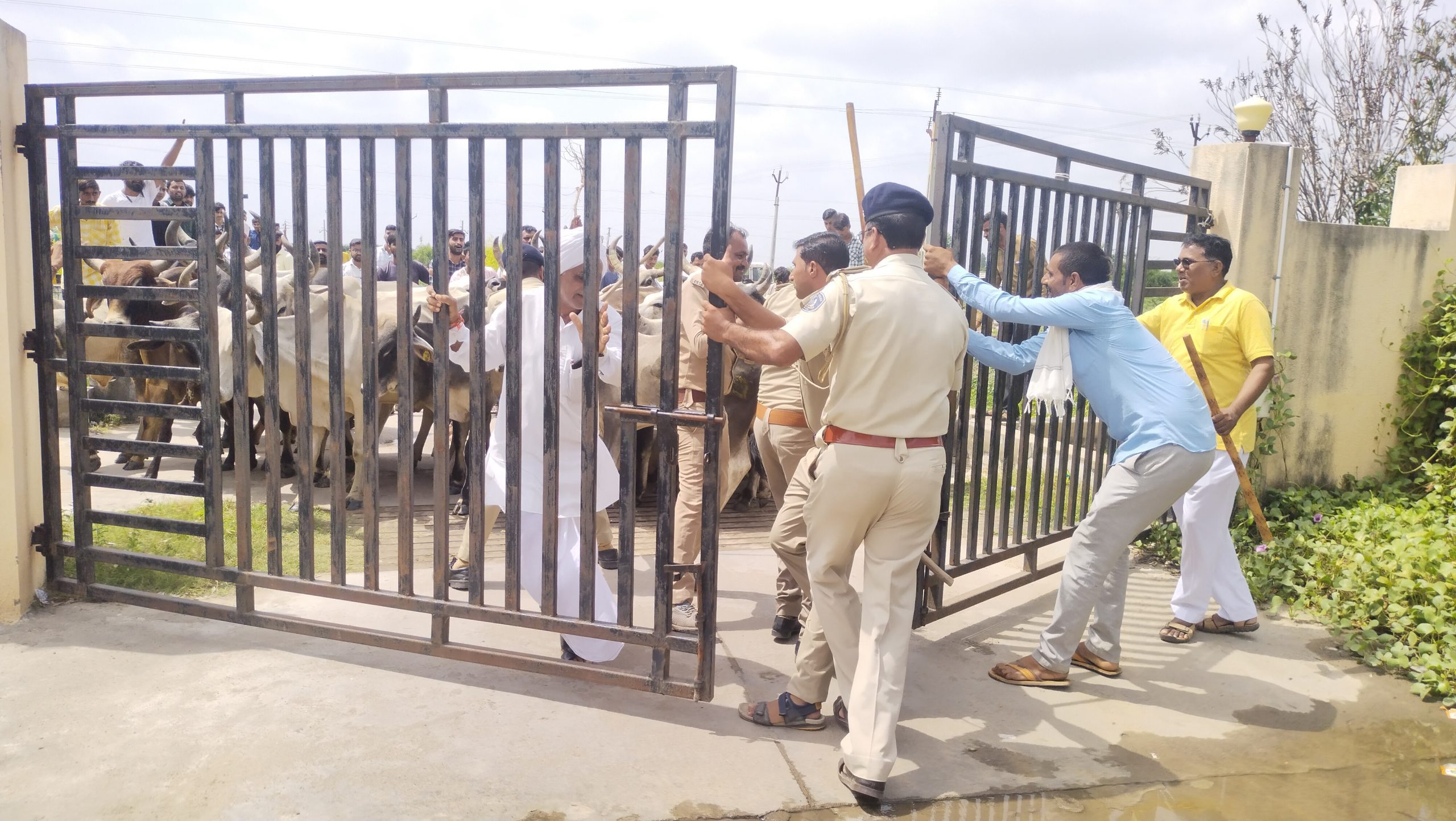 સેવા સદનની કચેરીમાં પશુઓને પુરવા જતાં અગાઉથી ત્યાં ચુસ્ત પોલીસ બંદોબસ્ત ગોઠવાઈ ગયેલો હોઈ ગૌસેવકોને તેમ કરતા અટકાવ્યા હતા, જેને લઈ પોલીસ અને ગૌ સેવકો વચ્ચે ખેંચતાણ થઈ હતી,જોકે ગૌસેવકોએ દરવાજો ખોલી પરાણે ગાયોને તાલુકા કચેરીમાં પુરી દેતાં પોલીસ દોડતી થઈ ગઈ હતી,