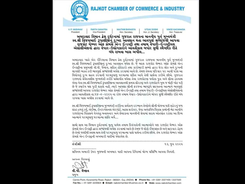 ગરવી તાકાત રાજકોટ : પૂર્વ મુખ્યમંત્રી વિજયભાઈ રૂપાણીના નિધનના શોકમાં શહેરમાં શોકનું વાતાવરણ છવાઈ ગયું છે. ચેમ્બર્સ ઓફ કોમર્સે આજે અડધા દિવસ માટે વ્યવસાય અને રોજગાર પ્રવૃત્તિઓ બંધ રાખવાની જાહેરાત કરી છે, જેમાં તમામ વેપારીઓને ભાગ લેવા વિનંતી કરવામાં આવી છે. બંધના એલાનને પ્રતિસાદ આપતા, વેપારીઓએ તેમની દુકાનો અને વ્યવસાયો બંધ રાખ્યા છે.