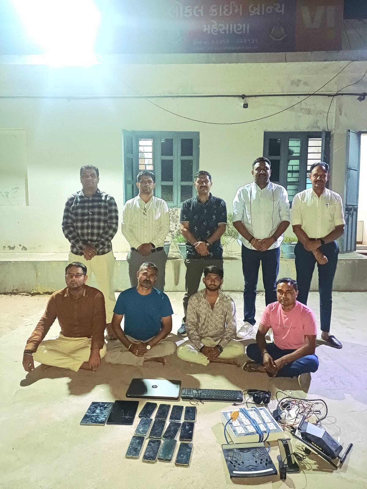 અને પ્રવિણજી ઉર્ફે પિયુષ જ્યંતિજી ઠાકોર (શિવગંગા-2, મહેસાણા)ને ઝડપી લીધા પોલીસે ઘટના સ્થળેથી રૂ.850 રોકડ,12 મોબાઇલ, લેપટોપ,2 ટેબ્લેટ,ચાર્જર,વાઇફાઇ રાઉટર,હેડફોન અને મોબાઇલના સ્ટેન્ડ મળી રૂ.1,70,750નો મુદ્દામાલ કબજે લીધો આ મામલે ઝડપાયેલા ચારેય શખ્સો સામે ગુનો દાખલ કરી વધુ તપાસ હાથ ધરી.