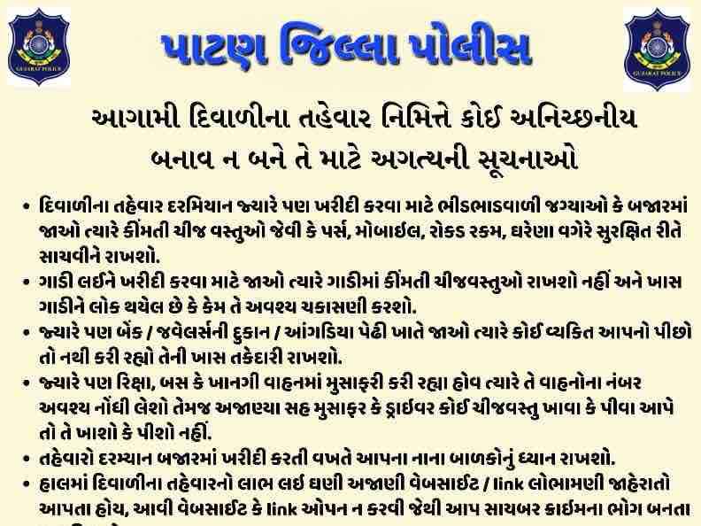 ગરવી તાકાત પાટણ : પાટણ પોલીસે આગામી દિવાળીના તહેવારો નિમિત્તે નાગરિકોને ખરીદી અને મુસાફરી દરમિયાન વિશેષ સાવચેતી રાખવા અપીલ કરી ચોરી, લૂંટ અને છેતરપિંડી જેવી ઘટનાઓ અટકાવવા માટે પોલીસ વિભાગ દ્વારા સુરક્ષાત્મક પગલાં અને માર્ગદર્શિકા જારી કરવામાં આવી. નાગરિકોને બજારમાં ખરીદી કરવા નીકળતી વખતે પર્સ, મોબાઇલ અને રોકડ જેવી કીમતી વસ્તુઓને સુરક્ષિત રીતે સાથે રાખવા સૂચન કરાયું આ ઉપરાંત, ઘરેણાં પહેરીને બજારમાં જવાનું ટાળવા અને વાહન લઈને જાવ ત્યારે કીમતી ચીજવસ્તુઓ ગાડીમાં ન રાખવા તથા ગાડી લોક કરી છે કે કેમ તે ચકાસી લેવા જણાવાયું. ખાસ કરીને બેંક, જ્વેલર્સની દુકાન કે આંગડિયા પેઢી ખાતે જતી વખતે કોઈ વ્યક્તિ પીછો તો નથી કરી રહી તેની તકેદારી રાખવી.