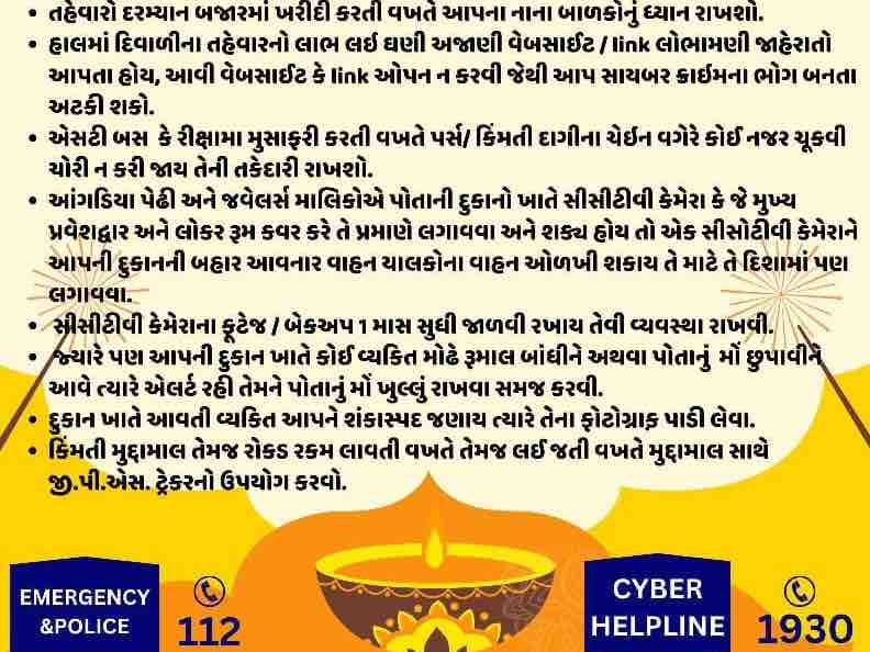 મુસાફરી દરમિયાન રિક્ષા, બસ કે ખાનગી વાહનના નંબર નોંધી લેવા અને સહ-મુસાફર કે ડ્રાઇવર પાસે કીમતી વસ્તુઓ ન મૂકવા ચેતવણી અપાઈ ભીડવાળી જગ્યાએ બાળકોનું ધ્યાન રાખવા અને કીમતી દાગીના કે પર્સ પર નજર રાખવા પણ સૂચન કરાયું. સાયબર ફ્રોડ અટકાવવા માટે પોલીસે જાગૃતિ ફેલાવી છે તહેવાર નિમિત્તે કોઈ વેબસાઇટ કે લિંક પર જાહેરાત આપવામાં આવી હોય, તો તેની લિંક ઓપન ન કરવી આમ કરવાથી નાગરિકો સાયબર ક્રાઇમનો ભોગ બનવાથી બચી શકે. દુકાનદારો માટે પણ પોલીસ વિભાગે ખાસ માર્ગદર્શિકા જારી કરી દુકાન કે પેઢીના માલિકોએ પોતાની દુકાન ખાતે સીસીટીવી કેમેરા મુખ્ય પ્રવેશદ્વાર અને લોકર રૂમને કવર કરે તે રીતે લગાવવા.