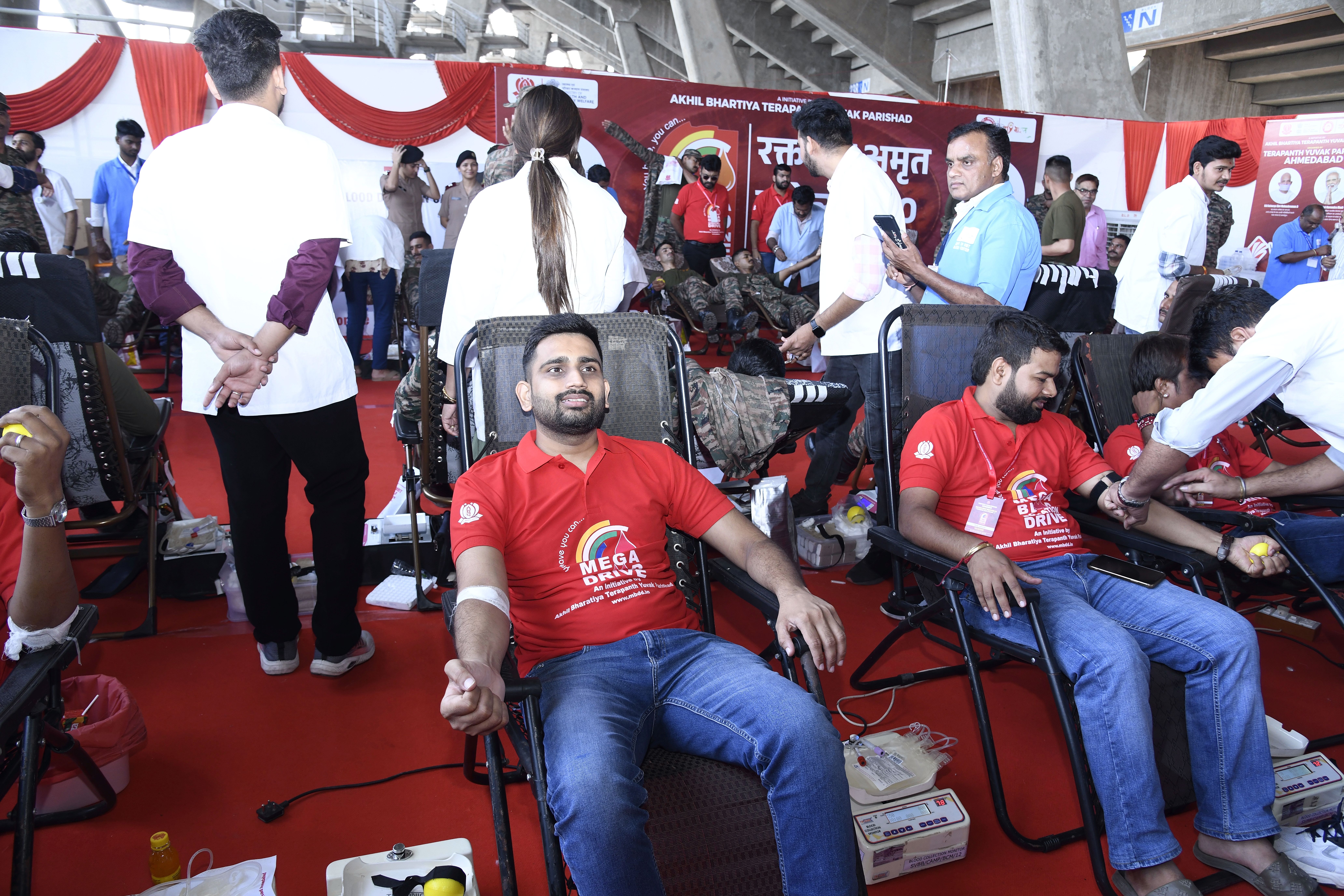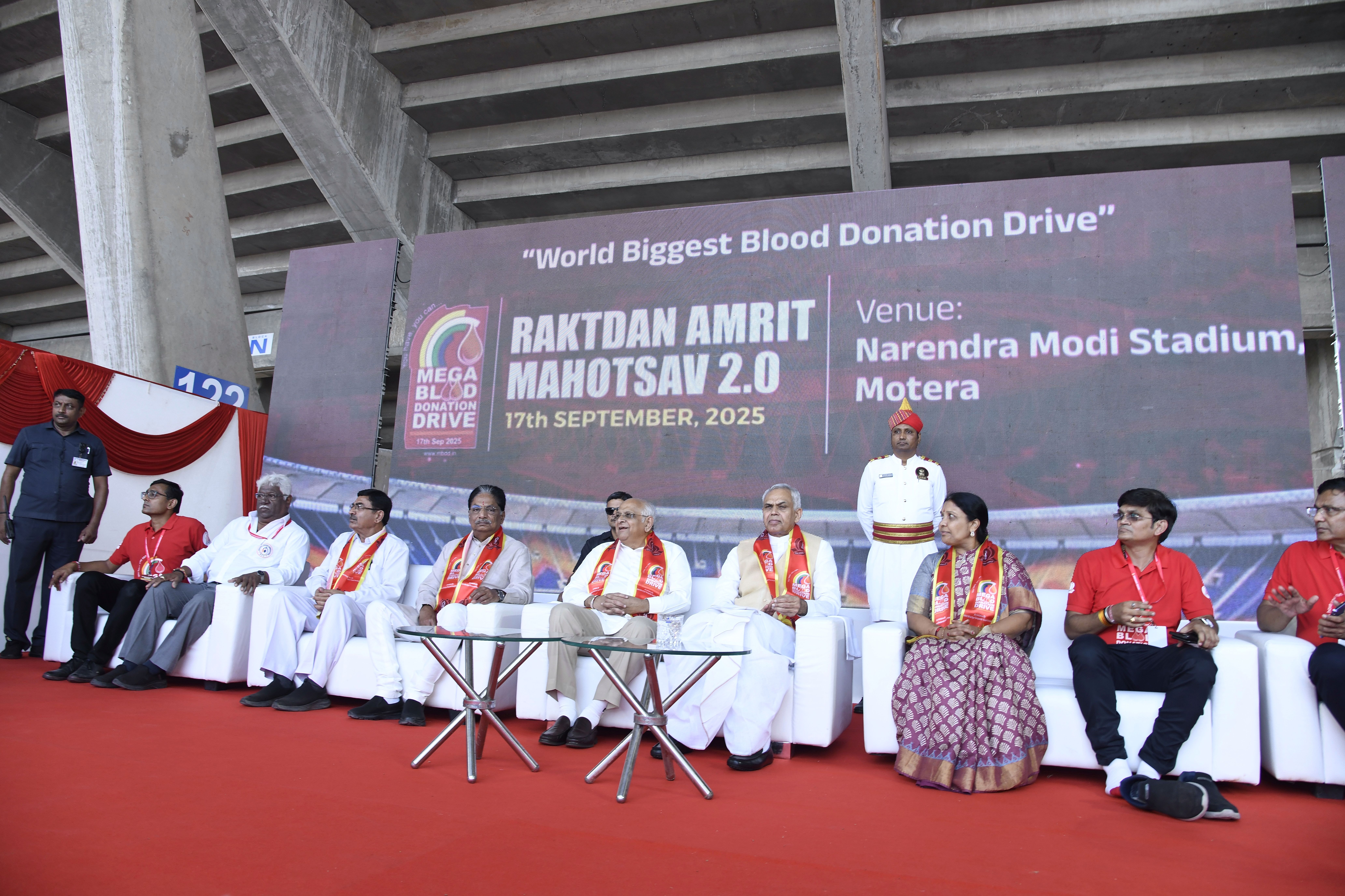 ગરવી તાકાત અમદાવાદ : પ્રધાનમંત્રી નરેન્દ્ર મોદીના 75મા જન્મદિવસ નિમિત્તે, અમદાવાદના નરેન્દ્ર મોદી સ્ટેડિયમ ખાતે વિશ્વનો સૌથી મોટો રક્તદાન શિબિરનું આયોજન કરવામાં આવી રહ્યું છે. આ કાર્યક્રમ અખિલ ભારતીય તેરાપંથ યુવક પરિષદ (ABTYP) દ્વારા ‘રક્તદાન અમૃત મહોત્સવ 2.0’ હેઠળ યોજવામાં આવ્યો છે. આ કાર્યક્રમનું વર્ચ્યુઅલી ઉદ્ઘાટન આજે સવારે વડા પ્રધાન નરેન્દ્ર મોદી દ્વારા કરવામાં આવ્યું હતું. મુખ્યમંત્રી ભૂપેન્દ્ર પટેલ, અભિનેતા વિવેક ઓબેરોય સાથે, આ કાર્યક્રમમાં ભાગ લીધો હતો, જેમાં દાતાઓને પ્રોત્સાહિત કરવામાં આવ્યા હતા અને રક્ત અને અંગદાનના મહત્વ પર ભાર મૂકવામાં આવ્યો હતો.