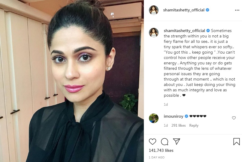 શમિતા શેટ્ટીએ પોતાના ઓફિશ્યલ ઇન્સ્ટાગ્રામ અકાઉન્ટ પર પોતાની એક તસવીર શૅર કરી છે જેનાં કેપ્શનમાં એક ખાસ નોટ લખી છે.તેણે લખ્યું છે કે “ક્યારેક-ક્યારેક તમારા અંદરની શકિત એક વિશાળ અગ્નિની જ્વાળા સમાન નથી હોતી, જેને સૌ જાેઇ શકે. આ એક નાનકડો તણખલો છે. તમને આ મળી ગઇ છે, આગળ વધતા રહો.