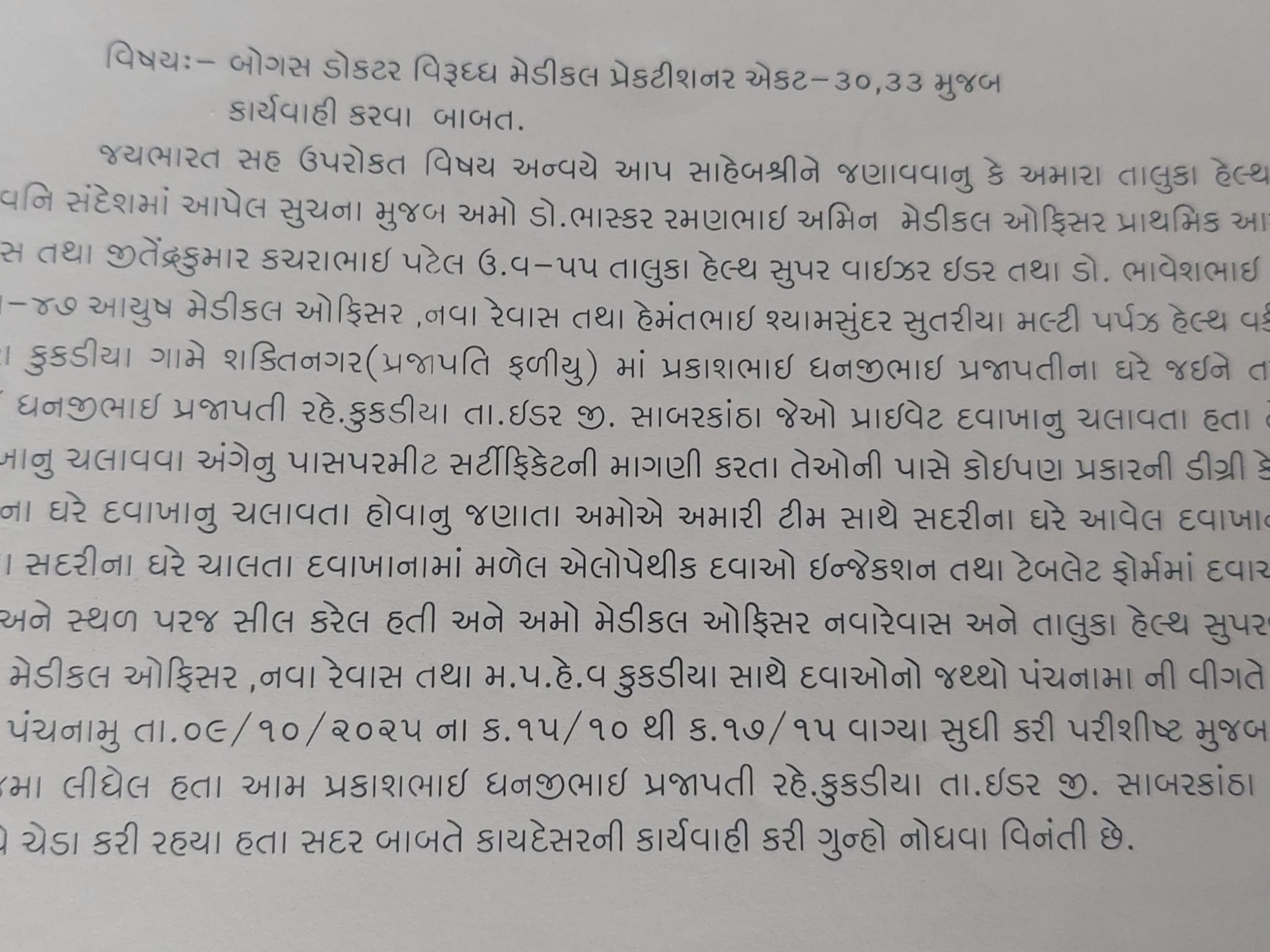 નવા રેવાસના આયુષ મેડિકલ ઓફિસર ડૉ. ભાવેશભાઈ ભીખાભાઈ પટેલ અને કુકડીયાના મલ્ટી પર્પઝ હેલ્થ વર્કર હેમંતભાઈ શ્યામસુંદર સુતરીયાનો સમાવેશ થાય ટીમે કુકડીયાના પ્રકાશભાઈ ધનજીભાઈ પ્રજાપતીના ઘરે તપાસ કરી. તપાસ દરમિયાન જાણવા મળ્યું પ્રકાશભાઈ પ્રજાપતી કોઈપણ માન્ય ડિગ્રી કે રજીસ્ટ્રેશન વિના પોતાના ઘરે ગેરકાયદેસર રીતે પ્રાઈવેટ દવાખાનું ચલાવી રહ્યા. ટીમે દવાખાનામાંથી એલોપેથીક દવાઓ, ઇન્જેક્શન અને ટેબ્લેટ ફોર્મમાં મળી આવેલી.