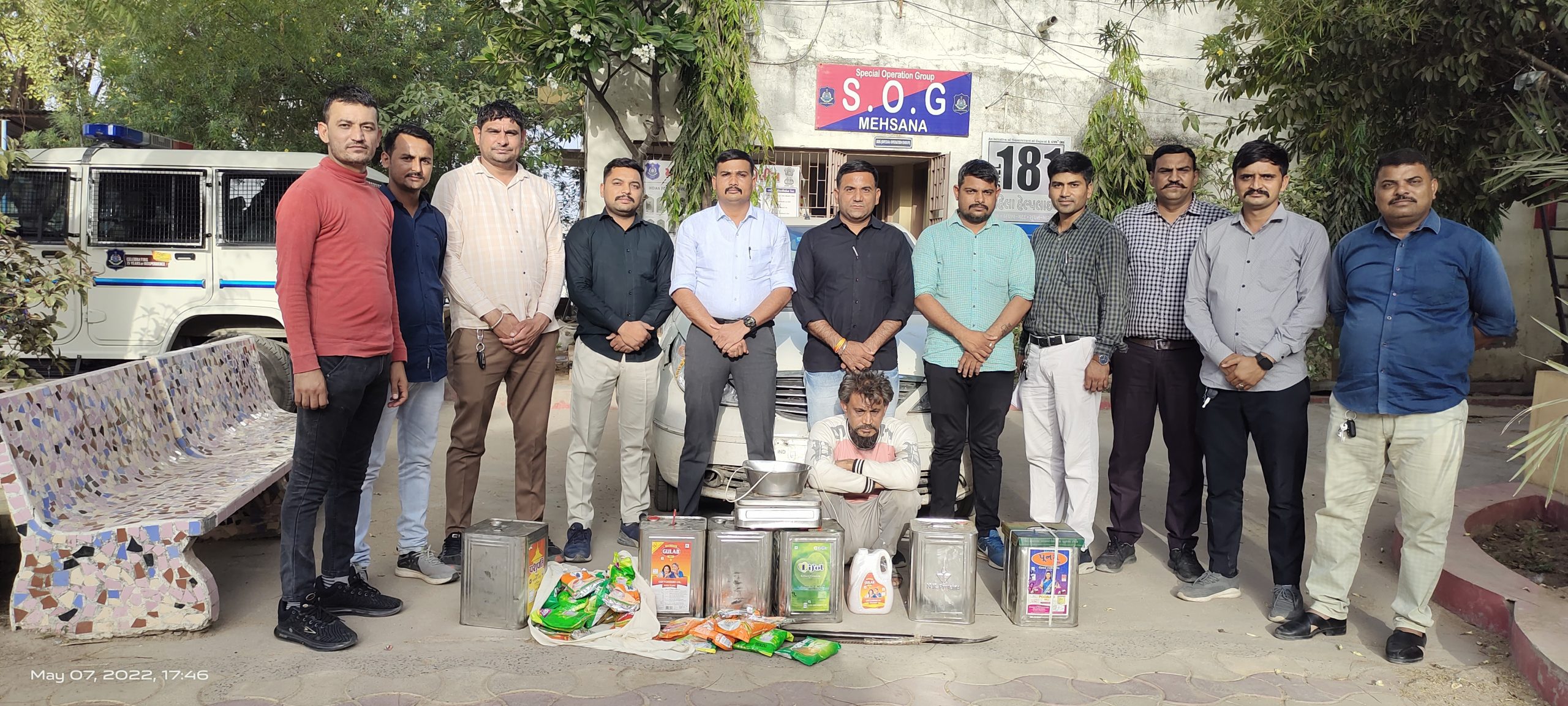 પકડી ઇસમને પાસેની ગાડીમાંથી તેલના નાના – મોટા અલગ અલગ કંપનીના ડબ્બા નંગ-7 કિંમત રૂપિયા 16,300/- તથા અલગ અલગ કંપનીના 250 ગ્રામ ના ” ચા” ના પેકેટ નંગ- 28 કિંમત 2800/- રબર ના સિક્કા, ઇલેક્ટ્રિક વજન કાંટો નંગ – 1 કિંમત 500/- તથા લોખંડની કોસ નંગ – 2 કુલ કિંમત મળી 19,600/- તથા સ્ફેલ કલર ની ટાટા કંપની ની ઇન્ડીકા વિસ્ટા મોડલની ગાડી કિંમત 1,00,000/- મળી કુલ કિંમત 1,19,600/- ના મુદ્દામાલ સાથે પકડી ઇસમ પાસે આધાર પુરાવા માંગતા નહિ હોવાનું જણાવતા અને ઈસમ જોડે પૂછપરછ કરતાં ચોરી કરેલ ગુન્હા કબુલાત કરી હતી.